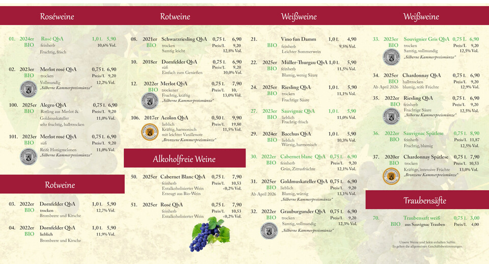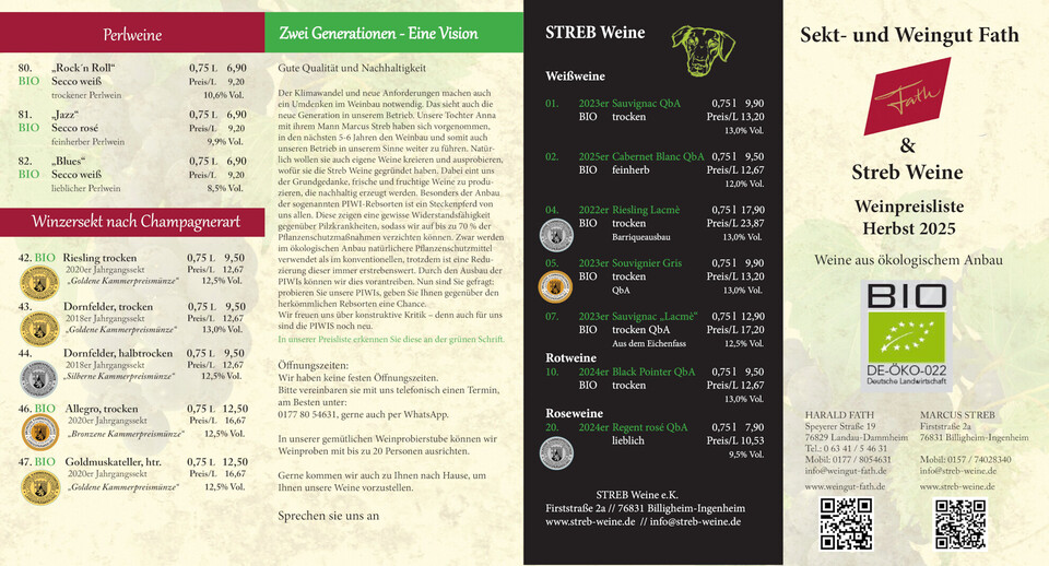 Gerne können Sie uns Ihre Bestellung auch per Mail an info@streb-weine.de mitteilen. Unser Sortiment sowie die Preise können Sie unserer Weinliste empfehlen.